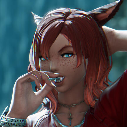 The 'Duskcat' with the alluring crooked fangy smile, blue piercing eyes with a hint of Keeper's dilation. Her short stature doesn't stop her from taking on big things. The Hannish sun laid its kisses on her skin, along with her bright clothing makes her stand out in the crowd.